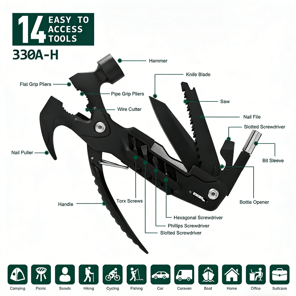 This multitool hammer combines multiple practical functions. It includes a solid hammer head, interchangeable screwdriver bits, wire cutter, bottle opener and small saw blade. Meets diverse usage needs without carrying multiple tools.