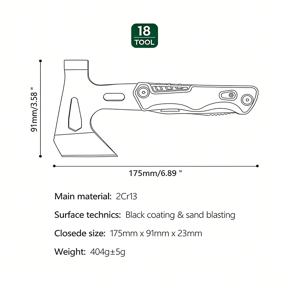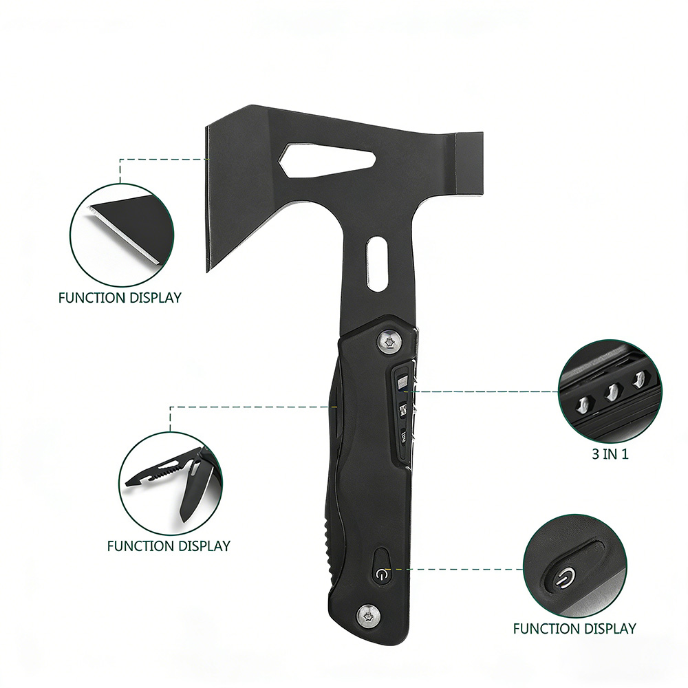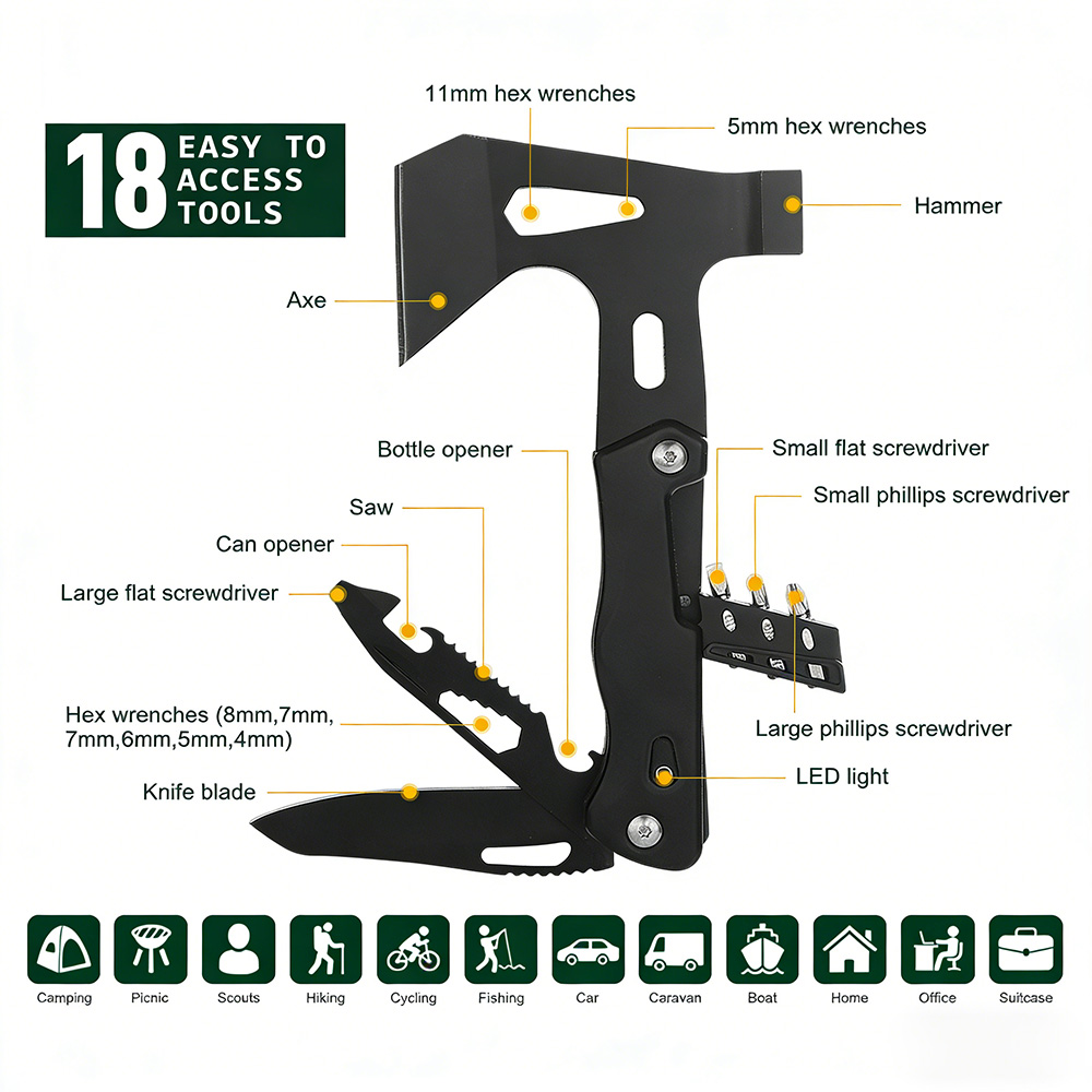 Perfect for hiking (trekking pole repair), cycling (bike adjustments), picnic, and car emergencies. Suitable for casual campers and seasoned adventurers alike. Upgrade your outdoor gear with this all-in-one 18-in-1 Axe Multi-Tool!